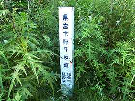 | 池の平林道は木賊峠と黒平町を結んでいる。木賊峠側は観音峠大野山林道と接しており、木賊峠の直ぐ先にある分岐路(写真中央)を左へ行くと観音峠大野山林道の終点側(一部の地図では木賊林道となっている)、右へ行くと池の平林道を通って黒平町へと至る。なお同林道は県営1339mと市営4422mで管轄が違うためそれぞれの場所に1本ずつ林道の杭が立っている。 | ||||||||||||||