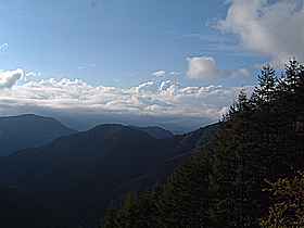 | 入り口から約800メートルほど走ると約2車線の広い道に出る(写真右)。この頃になると眺望はきかなくなるが、広い道なことと周囲の樹木が整備されているので薄暗さは感じられない。 | ||||||||||||||