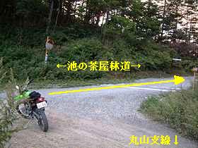 | この空き地は丸山支線の終点とも接っしており、空き地の最奧部に立つと丸山支線を望める(写真左)。また同地点は「F」の字のような三叉路になっており、縦棒と上の横棒が池の茶屋林道。2番目の横棒が丸山支線。池の茶屋林道は縦棒の下から入って上の横棒へと抜けていく格好になっている。三叉路の先に進むと道幅は少し狭くなる。といっても約1.5車線弱はあるから4輪同士での擦れ違いもなんとか可能だ。 | ||||||||||||||