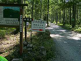 | 舗装路を約800mほど走っていった約3.8キロ地点では左手に小武川支線が延びている(写真左)。この小武川支線の道は青木鉱泉への入り口にもなっており、約1.1キロほど先の分岐路を右に曲がっていくと約600mで青木鉱泉へと達する。なお同地点には林道小武川線の起点杭が立っているが、延長表記は5704mとなっており、終点杭までの約3.8キロとは大きく食い違っている。また林道小武川線の起点もまだ遙か先であり、この杭の意味するところは不明である(小武川支線へと入っていくと約3.6キロ地点にも「林道小武川線」の杭が立っている。ただしそちらは韮崎市の市営林道の杭になっている)。 | ||||||||||||||