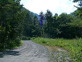 | 約2.4キロ地点からは再びダート路となり、直ぐ近くには小武川が流れている。この辺りでは僅か3mほどの小川だが、最終地点に至る頃には非常に広い川となる。ダートは600mと短く、その後は再び舗装路となって続いていく。※2003年11月に行ったところ、このダート路は既に舗装化されていました。 | ||||||||||||||