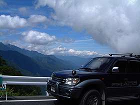 | 最後のダートは長さ約1.1キロのダートだが、こちらは舗装の工事が始まっており、かなりの人数で急ピッチな作業が行われている。この辺りになると標高が2000mに近く、8月というのにススキの穂がそよいでいた。最後のダートが終わると終点も近くなる。写真右の中央部分で山がV字型になっている場所が山伏峠になっている。 | ||||||||||||||