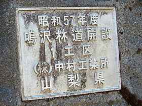 | 約3.6キロ地点の分岐路を右に曲がっていくと富士天神山スキー場へと続く道となり、場所によっては3車線に近い非常に広い道となる。余りにも広い道なので気がつく人も少ないだろうが林道鳴沢線は既に始まっている。実は約3.6キロ地点の分岐路が起点になっており、分岐して1.1キロほど進んだ側壁には開設標(写真中央)も埋め込まれている。さて分岐して約1.7キロ、国道139号を右折してからだと約5.3キロほど進むと「Fujiてん(富士天神山スキー場)」の入り口へと突き当たる(写真右)。 | ||||||||||||||