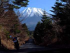 | 道幅は約1.5車線ほどあるので4輪同士での擦れ違いも問題ないだろう。周囲は木々に覆われており、樹間にはクマザサが長く生い茂っている。景観的には見るべきものもないので淡々と進んでいく形になるだろう。林道の看板から約1.4キロ地点(写真中央)まで進むと斜めに林道富士精進線(精進口登山道)が横切っている。富士精進線は鳴沢村と上九一色村の村界から富士山の5合目まで続く道らしいが、車両に関しては通行止めとなっている。通行止めの理由は補修工事となっているが、恐らく開くことはないだろう。標高的には1350mほどだろうか。富士山の1合目辺りで同地点は天神峠となっている。ここまで緩く上ってきた道だが、ここから先は緩いアップダウンの道へと変わっていく。 | ||||||||||||||