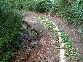 | 厚い樹林地帯を抜けると再びやや広い場所に出る(写真左)。先ほどよりずっと広いスペースだが(30m×20mくらい)、道以外は背の高い草が一面に繁っており、その周りを幾重にも樹木が覆っている。ここを過ぎると路面は更に荒れてくる。深いクレパスが延々と続き、路面もゴツゴツした石で走りづらい。 | ||||||||||||||