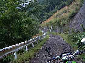 | 最後は奥山ロッジの横へと下っていく。ここには林道の看板が立っているが、更に約300mほど下っていくと三叉路の横にボロボロとなった林道の杭が側壁に立て掛けられている(ちなみに同三叉路を右に曲がると奥山温泉)。ここまで凡そ20キロ。山梨屈指の林道も漸く終わったわけである。 | ||||||||||||||