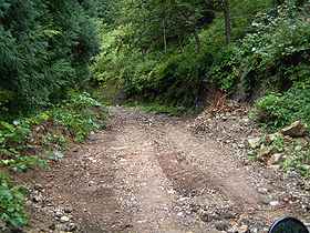 | 周囲の山が高く樹林帯の中を進むので眺望は殆ど望めない。途中からのダートはやや浮き石が目立つようになり、道幅も約1車線強と狭くなってくる。4輪では擦れ違いがちょっと辛そうだ。 | ||||||||||||||