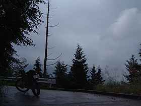 | 三叉路を約700mほど下っていくと谷側が開けて眺望の広がる場所がある。残念ながらあいにくの雨雲で景色は見渡せなかったが、晴天なら雄大な山々を一望できるのではないだろうか。景色は見られなかったが、急速に山を越えていく雲は見ていて爽快であった。 | ||||||||||||||