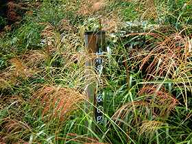 | 林道の杭から約12キロほど上ると坂のピーク(写真左)に達し、そこから先は概ね下っていく。ピークから約100mほど下ると古びた四阿があり、横には山小屋「月夜の段」という杭が立っている。「段」とは山の中の平らな場所を指し、月夜の段という名称は樹木が鬱蒼と茂り、昼間でも太陽光が地表に届かず、月夜ぐらいの明るさしかない、ということから名付けられたという。また戦後まだ間もない昭和22年には開拓のため十八戸が入植しているらしいが、苦しい開墾作業の甲斐もなく2年後には全戸が下山を余儀なくされており、今では苦闘の跡もササの中に埋もれてしまっている、とのことだ。なお同地点は十枚山(1726m)の東にある森林地帯で標高は約1200mほどらしい。 | ||||||||||||||
