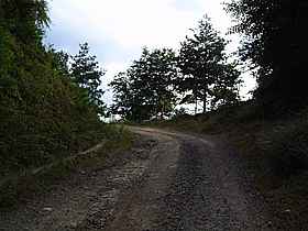 | 約2.1キロ地点まで進むと作業用に造られたと思われる空き地が道の右側に広がっている(写真左と写真中央)。一角には土を盛った小山があり望所的な役割を果たしている。特に素晴らしいというほどではないが、頂上に登ると連なる山々を見ることができる(写真右)。 | ||||||||||||||