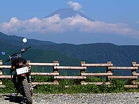 | 中村バス停から約8.9キロほど進むと佐野峠に達する。上佐野線の終わりは突然やって来る。カーブを曲がった途端に富士山が正面に現れ、何も知らないで行くと「え?」と思ってしまうだろう。それまでが薄暗くて狭い道だっただけに、目の前に現れる富士山はちょっと感動的だ。 | ||||||||||||||