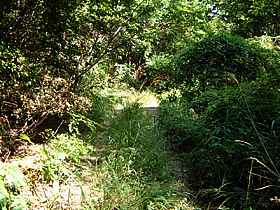 | 先に進めば進むほど道は悪くなる。周囲は厚い樹林に覆われているため10メートル先も見えないほどで、約600mほど進んだ地点では何処から何処まで道なのかも分からないほど草に覆われる。 | ||||||||||||||