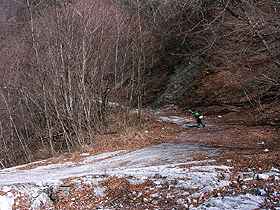 | そこから先の道は少しガレてくる。路面は白砂と白石が混ざった状態で路肩も脆そうだ。道幅も1車線強しか無く場所によってはガケ側が崩れていたりする。更に数100mほど進むと左側に「治山工事用道路」の看板があり、一般車両はご遠慮下さいの文字(汗)。 | ||||||||||||||