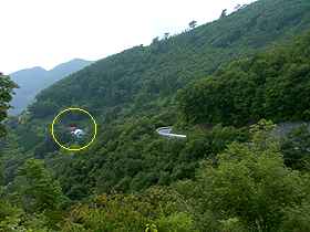 | 大鳥橋から約8.2キロ地点まで進むと、屋根に「天空菜園・八坂村」と書かれ家屋が建っている。住人参加型の体験施設云々ということらしいがよくは知らない。約8.6キロ地点(写真中央)まで進むと、眼下に県道416号沿いの集落(写真右)を見下ろす。周囲を峻険な山々に囲まれた非常に山深い場所にある集落だ。 | ||||||||||||||