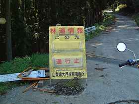 | ここまでの道はやや長いが、県道30号の「和見入口」からだと約4.5キロほど進んだ地点に林道の看板が立っている。当日は通行止の看板が出ていたが全く問題なく通ることが出来た。いつも思うことだが、問題ないならこういった看板は出さないで欲しいものだ。 | ||||||||||||||