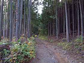 | 何度かアップダウンを繰り返すが勾配はそれほど大きくない。全線で緩い上りと下りを繰り返しながら八雲池へと続いていく。林道の杭から約2.2キロ地点まで進むと足馴峠へと続く作業道が左手に延びている(写真右)。足馴峠への林道は丸山林道側からも開設しており、将来的にはそちらと繋がるのかもしれない。 | ||||||||||||||