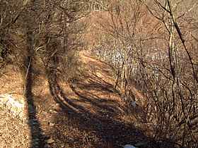 | 約2ヶ月前とほぼ同じ場所にバイクを停める(写真左)。積雪ということを除けば冬枯れした景色は1月と殆ど変わらない。約100mの短い舗装路のあと、分岐後、約300m地点から再びダート路となる。周囲は細い樹木で閉ざされており、夏場は陽も射さないほど枝葉が伸びるのではないだろうか。 | ||||||||||||||
