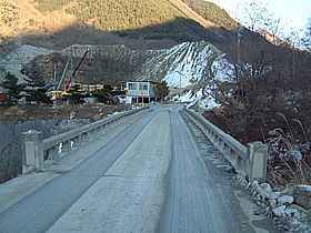 | 約200mほど進むと立沢橋があり(写真左)、渡ると直ぐに左側が採石場となっている(写真中央)。その横を抜けていくと約100mほどで広いダート路になり暫くは川に沿って上っていく。 | ||||||||||||||