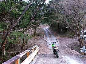 | 橋を渡るとコンクリート路となるが約1車線という非常に狭い道となる(写真左)。橋の先の右側には数台分の駐車スペースがあり、850mという延長から考えてもこの橋の辺りが終点なのかもしれない。が、道は更に続いているので進んでみた。コンクリート路は約100mほどでダート路に変わり、その直後には路肩の崩れた場所があった。軽自動車でも通れるかどうかの道幅なので4輪ではやめておいた方が無難だ(写真中央)。 | ||||||||||||||