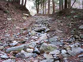 | 約1キロ地点からは勾配の大きな荒れた道となり、4輪はもとより2輪でも注意しないと転倒する。最後は林道の看板から約1.3キロほど進んだ谷止ダムに突き当たって終わる(写真右)。周囲は「アオギリ林」に囲まれており、これは山梨の森林100選に選ばれているということだ。最終地点にはアオギリ林を説明した看板と森林100選の看板が立っているが、他には何もない。 | ||||||||||||||