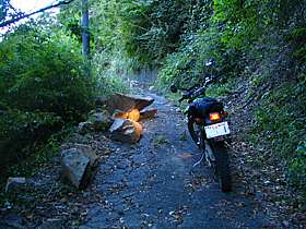 | 大垈線の林道杭から約1.7キロ地点(写真左)には三菱ギャランGTO(写真中央)が廃棄されており、その約200mほど先となる約1.9キロ地点(写真右)では道幅いっぱいに広がる落石となっていました。2輪なら横を抜けられるので全く問題ありませんが、4輪ではこの落石を取り除かない限り通行することは出来ません。 |