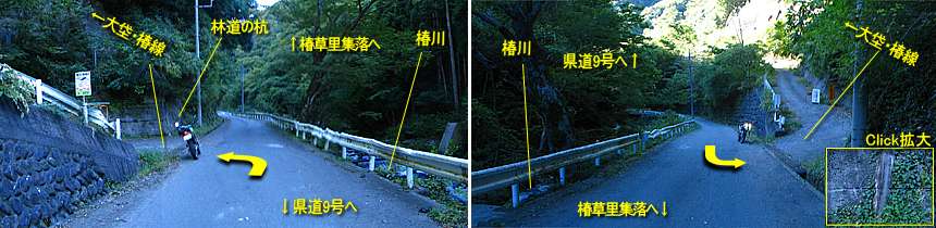 | 林道大垈・椿線と林道大垈線は身延町の椿草里地区と大垈地区を結ぶ林道です。大垈・椿線/大垈線へ行くには、まず県道9号で身延町の塩之沢駅を目指します。塩之沢駅の約150mほど南に椿草里地区へと入っていく町道があるので、椿川に沿って約2.9キロほど東進します。県道9号から約2.9キロほど進むと左へと折り返していく道(写真左と写真右)があり、同地点が大垈・椿線の起点となっています。正面に古びた林道の杭が立っていますが、夏場などでは半ば草に覆われた状態です。スピードを出していると見逃してしまうかもしれませんので注意して進みましょう。補足)ここまでの詳しい道筋については林道三石山線(椿・大垈工区)を参照してください。 |