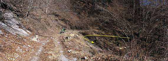 | ピークを左へ折れると約200mほどの直線路(写真左)が続いており一気に下っていきます。両側は土壁(写真中央)と樹林層で景色はありません。なお路面はかなり軟弱で、大きな石等はありませんが深さ10センチ程度の轍が縦に幾重にも走っています。2輪はハンドルを取られかねないので注意した方がいいでしょう。 |