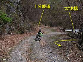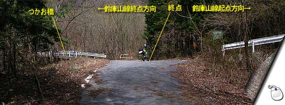 | せっかくなので鈴庫山線の終点方向も簡単に記載しておきます。左へ曲がると直ぐに雷川の「つかお橋」を渡っていき、渡り切ると直ぐに分岐道が右手に現れます。この分岐道に入ったのはもう何年も前なのでハッキリとは覚えていませんが、最後は廃道同然の状態(木々が路面から生えた状態)で行き止まりだったように思います。補足)現在の鈴庫山線はこの「つかお橋」から先だけが未舗装路です。 |