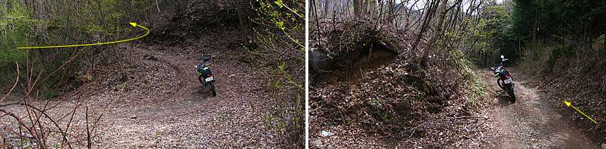 | 分岐点を右折した道は直ぐに未舗装路(写真左)となり、それと同時に一時的な短い下り坂へと転じます。しかし直ぐに上り坂(写真右)へと戻り、暫くは釜沢を挟んだここまでの道を見下ろしながら進みます。道幅的には約1.5車線弱。勾配はやや大きめです。 |