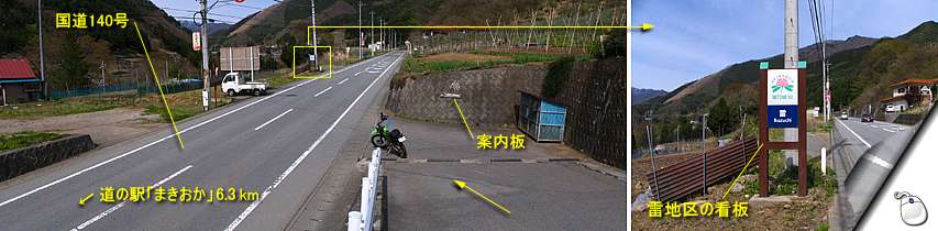 | 分岐点から約700mほど下ると雷(いかづち)地区の集落(写真上左)となり、約800m地点で雷大明神(写真上中央)へと至ります。ここからは幾つかの分岐道がありますが、そのひとつを下ると約1.7キロ地点(写真下左)で国道140号へと行き着きます。国道140号へ出た場所を右に曲がると約1.2キロで「お伊勢の宮」となり、左に曲がると約6.3キロで道の駅「まきおか」です。同地点には「雷」と書かれた看板や、「↑川浦口留番所/不動滝→」と書かれた案内板があるので逆側から入る場合はこれらを指標にするといいでしょう。 |