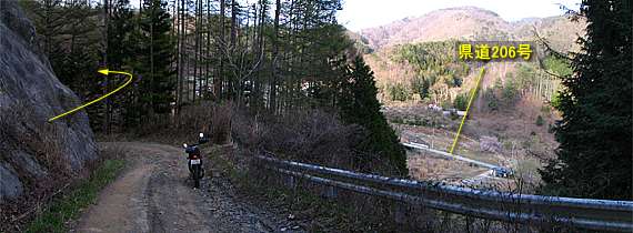 | 林道の杭から約11.8キロ地点(写真左)まで進むと右手に県道206号(写真右)がハッキリと見えるようになってきます。同地点から見える県道206号は東山中部線と合流間近の県道206号で、ここまで来ると残りも僅かです。 |