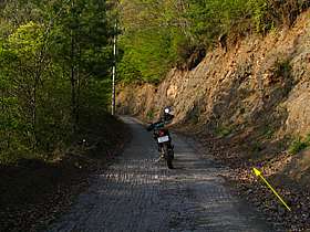 | 何処までも続く山、山、山。折八古関線の魅力はなんといってもその山の奥深さにあると思います。林道を余り走ったことのない方や知識がなく迷い込んでしまった方などでは、遙か先まで続く山の連なりにむしろ不安を覚えてしまうかもしれません。最初から最後まで綺麗な舗装路が続くのでオフローダー派にとっては物足りないかもしれませんが、オンロード派にとっては気軽に山の深さを実感できる林道です。晴れた日に上九一色村側から入ることをお勧めします。 |