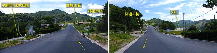 | 杣口線の起点から約5.9キロ地点まで進むと前方に琴川ダム(写真上左)が見え始めます。杣口線は2002年ころから道の拡幅と大幅な改修工事がなされており、この辺りから終点まではセンターライン付きの綺麗な道(写真上右)が続きます。同付近では時おり旧塩山市方向の町並みを望み、約7.3キロ地点(写真下)ではここまでの道を左手に見ながら進みます。 |