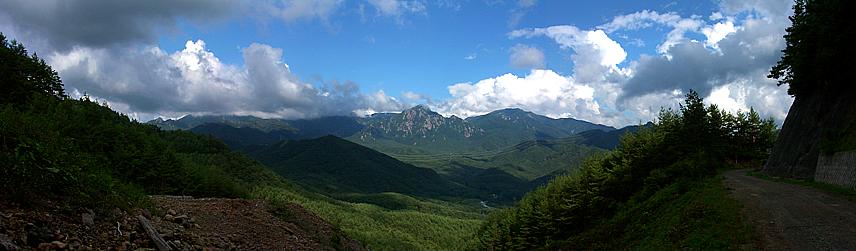 | 横尾山線は長らく信州峠側からと清里地区側からの開設工事をやっていましたが、2004年ころに完成して通り抜けることが出来るようになりました。その延長は20724mで、9割以上の道が未だ未舗装路のまま残されています。道筋からは広大な森林地帯を通して望む瑞垣山(写真上)や、裾を延ばした綺麗な八ヶ岳(写真下)など随所で素晴らしい景色が広がります。注意)不法投棄防止のため信州峠側起点〜大平牧場までの区間(約5.7キロほど)が簡易的な鉄柵で仕切られていることがあります。その場合は県道610号から大平牧場へ上ると、清里地区側のみ通行することが可能です。 |