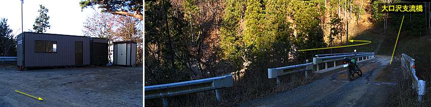 | 当日の日没は午後4時36分前後。写真を撮っていた時間は5分ほどでしたが、その僅かな時間にも辺りはいつの間にか陽が陰ってしまいました。ということでここからは急ぎ終点へと向かいます。プレハブ小屋(写真左)から約300m(起点からだと約7キロ)地点まで進むと大口沢支流橋(写真右)を渡ります。 |