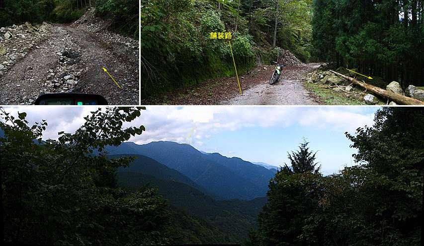 | 当日は林道の杭から約8.4キロ地点で深さ10センチ程度の段差(写真上左)を何ヶ所かで見受けました。一般的なセダン型でもそれほど問題にはならないとは思いますが、やや大きめの石が転がっていたので或る程度は注意した方がいいかもしれません。約4.5キロ地点から続いてきた未舗装路は約8.6キロ地点(写真上右)でコンクリートの舗装路へと変わり、このとき北西方向に再び静岡県境の山々(写真下)を望みます。 路面拡大 |