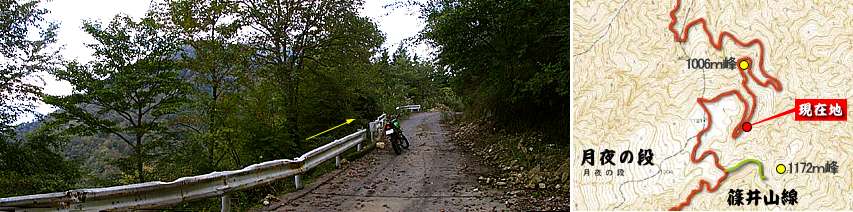 | 約8.6キロ地点から続いてきた舗装路ですが、林道の起点から約11.2キロ地点(写真上左)まで進むと未舗装路へと変わります。特に大きな段差等はありませんが、砂利を敷き詰めたような路面(写真上右)には大きめの石が目立ちます。約11.5キロ地点(写真下)まで進むと鋭角的に左へと切り返し、ここまで来ると月夜の段までは残り僅かです。 |