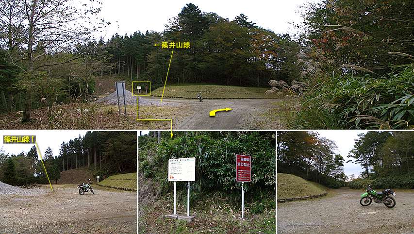| 林道の起点から約12.6キロ地点(写真上)まで進むと広く開けた場所へと行き着き、同地点からはほぼ等分に分かれる形で篠井山線が左へと分岐(写真下左)しています。分岐点の左側には篠井山線の看板(写真下中央)が立っているので間違うことはありませんが、剣抜大洞線は同分岐点を右(写真下右)へと進みます。 |
