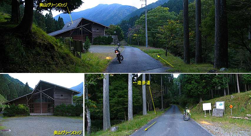 | 林道の杭から約20.3キロ地点(写真上と写真下右)まで進むと奥山グリーンロッジが道の左側に建っています。奥山グリーンロッジは南部町営の施設で、青少年が自炊をしながら宿泊できる野外レクリエーション施設だそうです。営業期間は4月から11月まで。年中無休だそうですが、利用するには団体であることなどの規定があるようです。 |