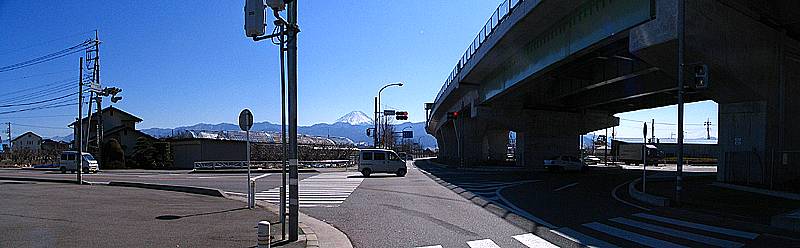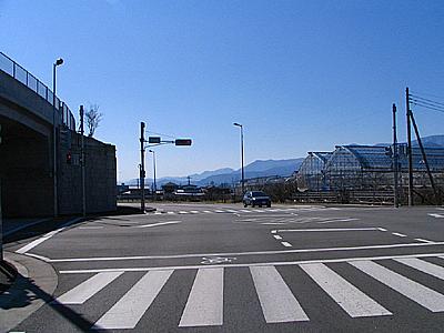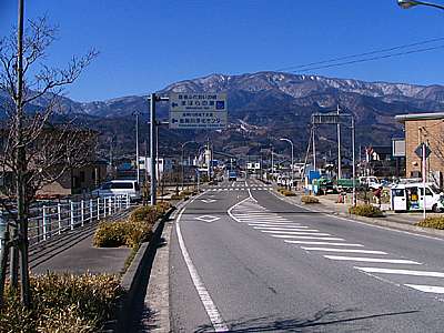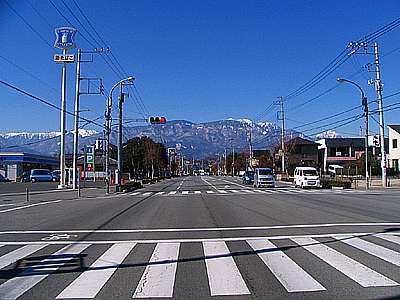 | 午前11時43分 甲西バイパスの「甲西工業団地南」交差点を右折。 ここからは西へと向かい、増穂町の舂米(つきよね)地区へと向かいます。 ちなみに正面の山は櫛形山2051.7m。 2000mを越える高い山なので山頂は雪で覆われています。 |