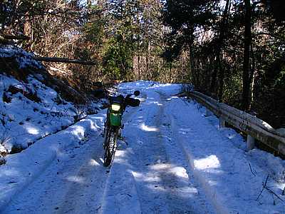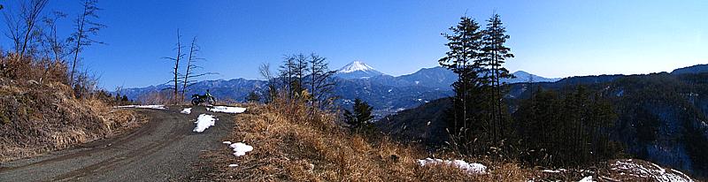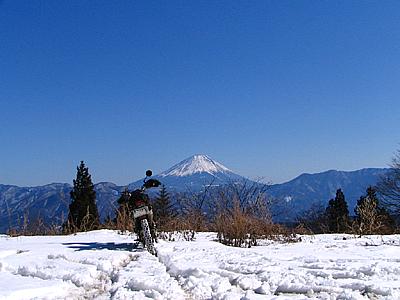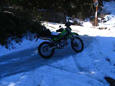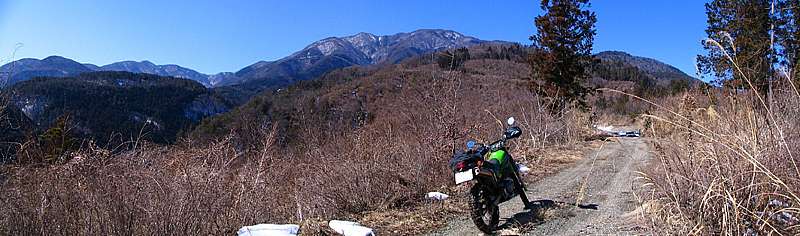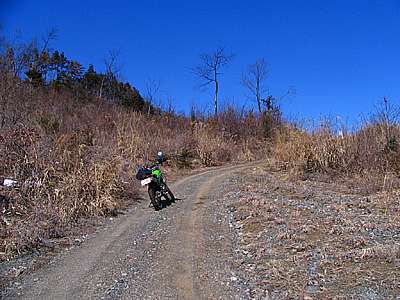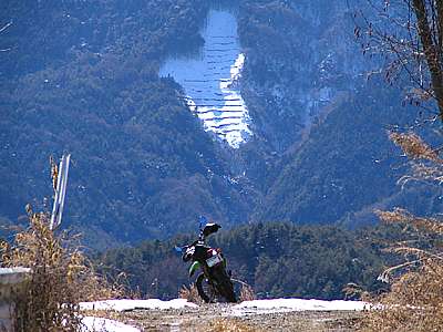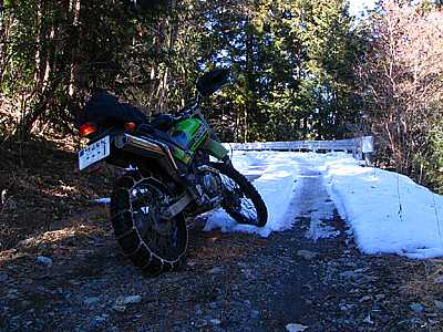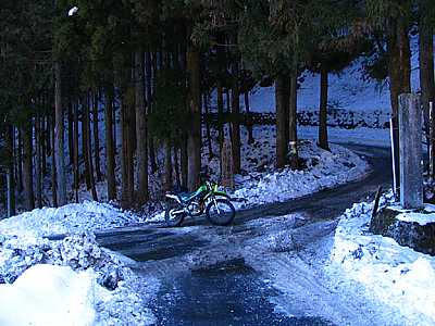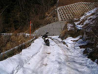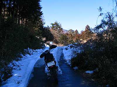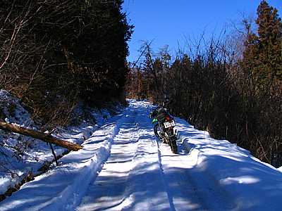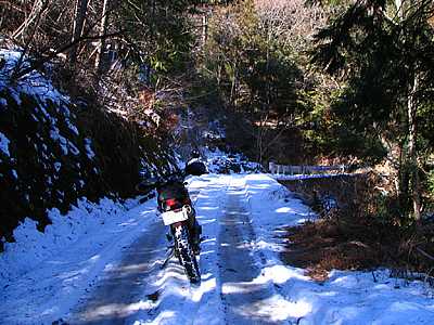 | 2008年2月19日 降雪から10日。 朝から抜けるような青い空。 東西南北の何処を見廻しても雲ひとつない状態です。 こんな日に仕事をしているのは勿体ない、ということで久しぶりに林道と名のつく場所へ行ってみることにしました。 午前10時30分 バイクカバーを外すも、実はバイクに乗るのは1月25日以来です。 バッテリーもそろそろ寿命を迎えつつあり、愚図つくエンジンはなかなか掛かりません。 お湯で暖め始動させるのに約15分。 出発したのは午前10時45分を廻ったころでした。 |