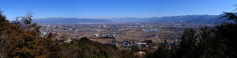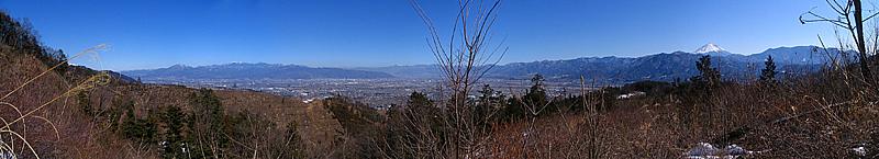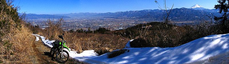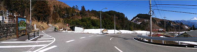 | 午後12時36分 坂道を切り返して南へ。 背後の正面は甲州市方向で、その上部には雪を被った大菩薩の峰々が連なります。 当日は1日を通して雲ひとつない快晴。 空気も澄んでいたので抜群の景色を見ることができました。