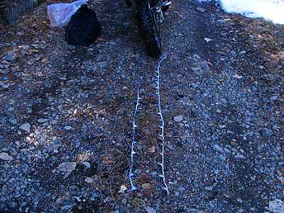 午後12時16分 10分ほど掛けてチェーンを装着。 通常はゴムでチェーンを引っ張るのですが、この程度なら外れる心配もないので今回は省略。 巻き方も手抜きをしてユルユルの状態です。 |