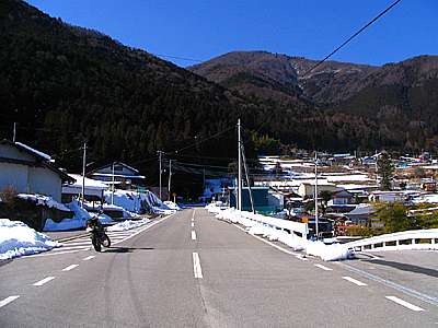午後1時25分 県道413号へ出てきました。 同地点からは右折(進行方向から見て)して平林地区の集落へと上ります。 なお、この辺りでの標高は800m前後。 日影では僅かに凍結部分もありますが、殆どの場所では綺麗に除雪されており溶けきっている状態です。 |