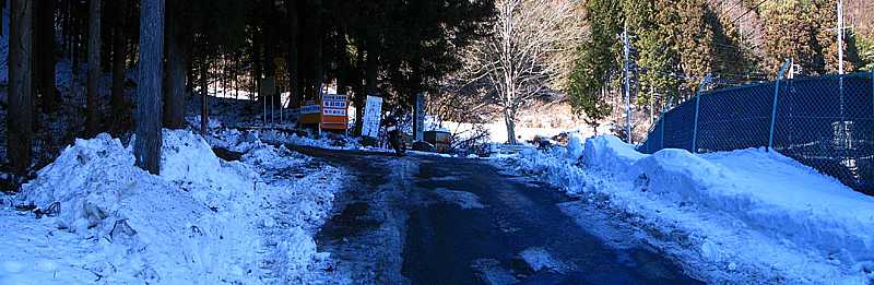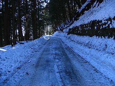 | 午前11時50分 入り口付近は雪の痕跡など全く見られなかったのですが、数100mほど進んだ地点で凍結路です。 |