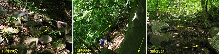 | 歩き始めて約30分。勾配や路面が厳しくなったとはいえ、ここまで明確的に続いてきた道筋が些か不明瞭になってきます。遠くからだと道は何処だ?と思ってしまうかもしれません。が、前方の岩に視線を送ると、赤ペンキの矢印が見えると思います。登山経験の殆どない自身にとっては、この矢印がなかったら単なる沢にしか見えなかったかもしれません。 写真下の拡大 |