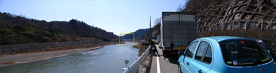 | 午前11時08分 鰍沢町へ入ったところで車の長〜い列。 左を流れているのは富士川。 その先には「富士川ドライブイン/塩の華」が見えていますが、そこまで行くのに15分近く掛かってしまいました。工事による片側通行のためだそうですが、最近の国道52号は工事が多い気がします(最近というか昔からというか.....)。 |