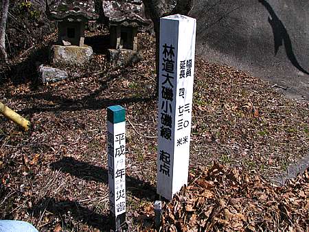 午前11時54分 市町村道の終点。 と、ここでカズさんが林道の起点杭を発見! 林道名は地区の名称と同じく大磯小磯線で延長は4723mだそうです。地図ではこの先に峰山という表記を見ることが出来ますが、果たして何処まで通じているのでしょうか。 思いも掛けぬ林道だっただけに少々胸が高まります。