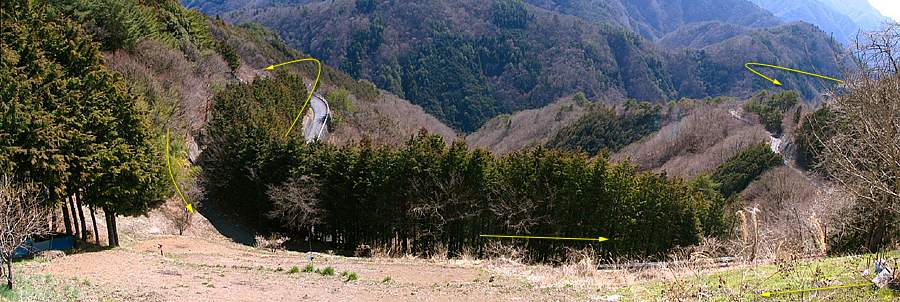 午後1時56分 標高が上がって県道414号を見おろします。 ただ完全な山あいの場所なので、特別になにかを見通せるような景色はありません。 |