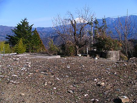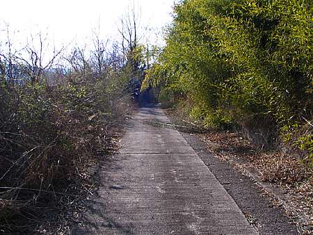 | 午後3時20分 奥行きは30mくらいだったでしょうか。 車道の先にも幅2mくらいの狭い通路が続きます。 その最奥部は家屋の取り壊された空き地になっており、玄関跡や風呂場跡など、かつて生活していただろうとという痕跡が各所に見られます。 空き地に立つと正面に開けた気持ちの良い景色が広がりますが、それだけに無人となった地は何処か物悲しく、「なんだか悲しくなりますね」と言ったカズさんも同じことを感じていたようです。